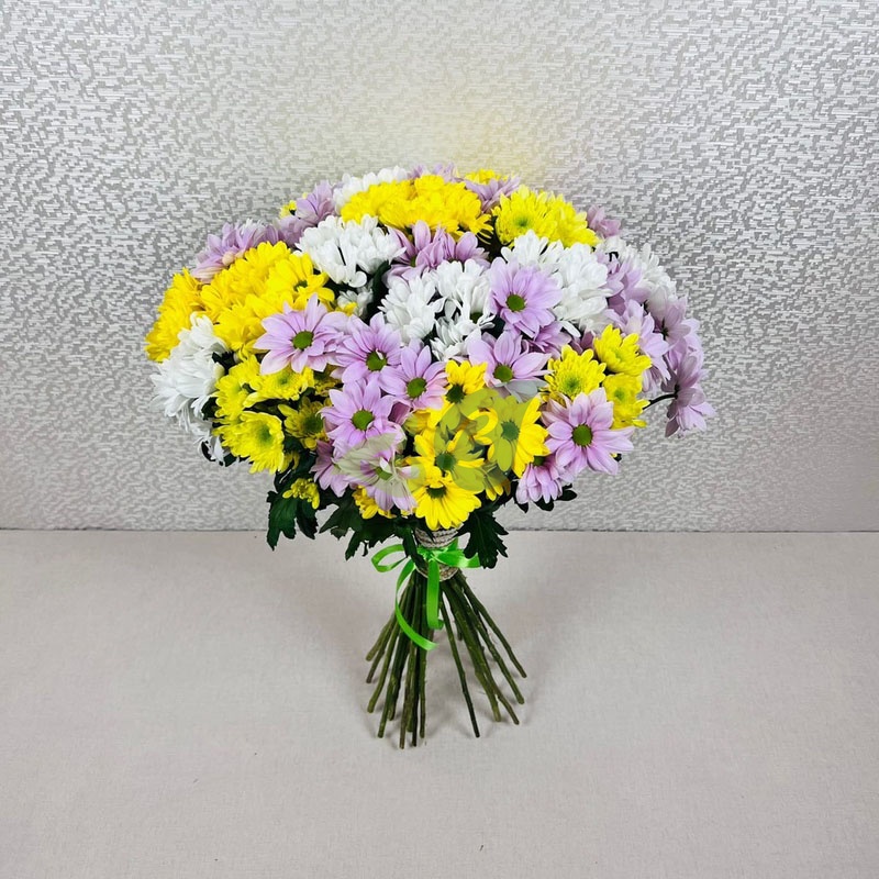 Закажите большой букет из сиреневых, белых, желтых и розовых хризантем и доставка по Соль-Илецку будет бесплатной.