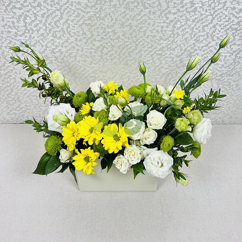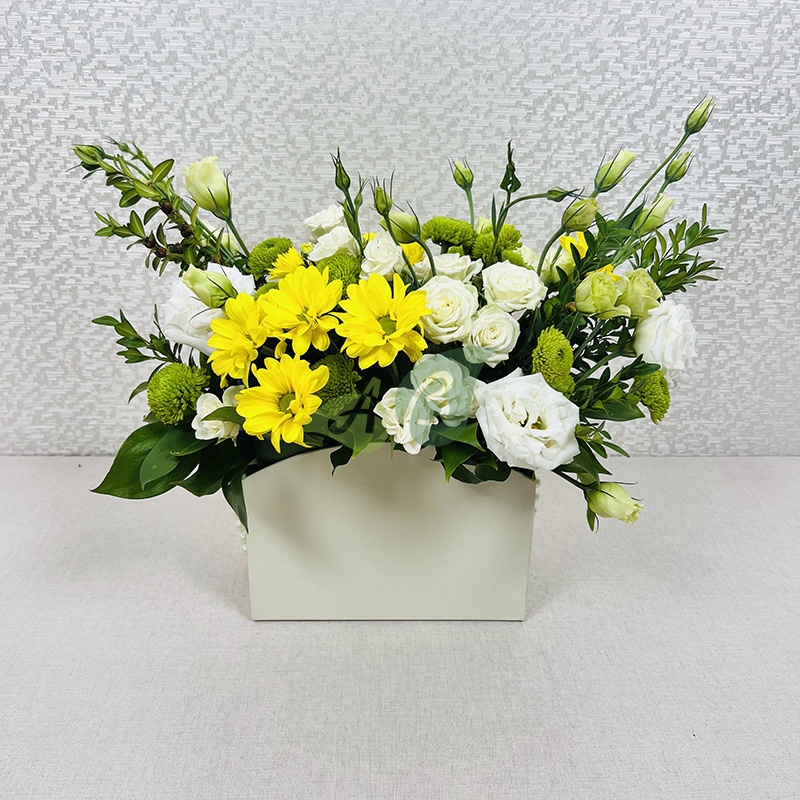 Облако кустовых роз и желтые хризантемы в коробке – такую прелесть можно заказать с доставкой в любой район Соль-Илецка.