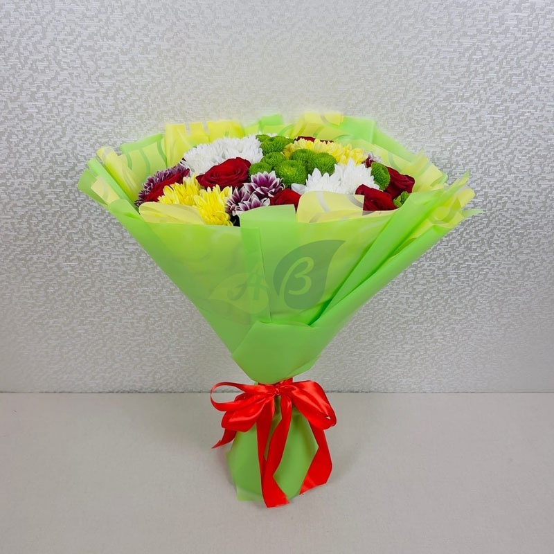 - Хризантема кустовая - 12 штук, цвет - микс, длина стебля - 60 см;