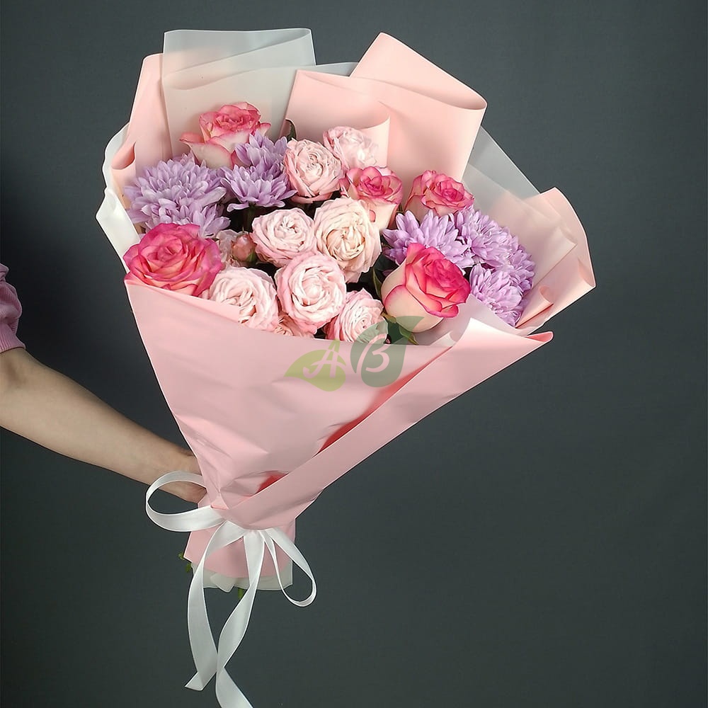 Состав и характеристики букета из кустовых роз и хризантем "Тёплые объятия":
